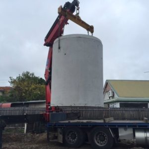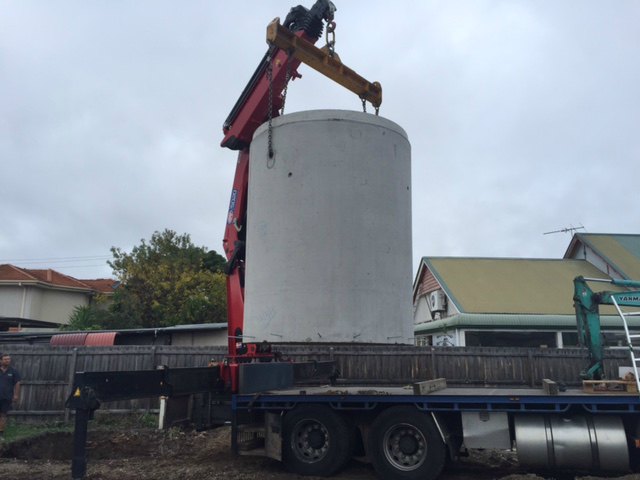 In one of our recent jobs we installed a 10,000 litre concrete water tank in a residential area in Melbourne. As the pictures below show, correctly positioning and installing a rainwater tank is a big undertaking. It takes time, experience and the right equipment – and that’s why people turn to R & F Building Industries for help.